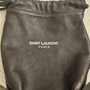 Elegant black leather bucket bag with drawstring closure. Features a stylish chain strap.