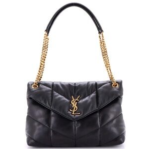Chic black leather Lou Lou puffer bag with elegant gold chain straps. Iconic YSL logo detail.