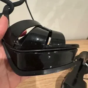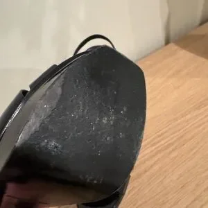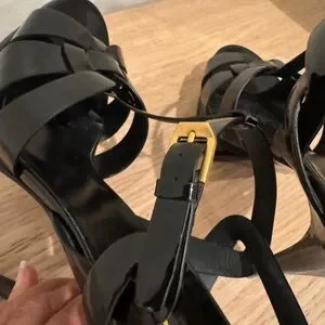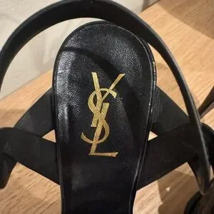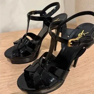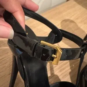 Saint Laurent Black Patent T-Strap Heels with Gold Logo