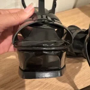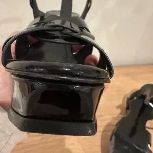 Chic Saint Laurent patent leather heels. T-strap design with woven front straps. Adjustable ankle buckle and sleek silhouette. Glossy finish for polished looks.