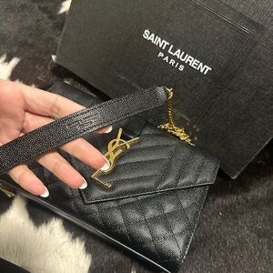 Elevate your style with the Saint Laurent black quilted leather bag. Perfect for any occasion, this elegant accessory adds a touch of luxury to your ensemble.