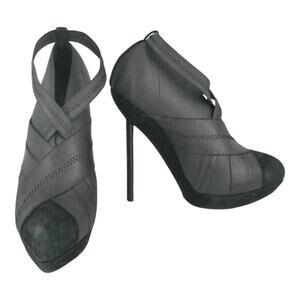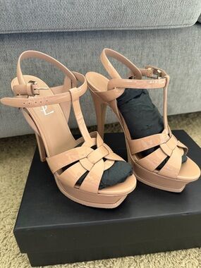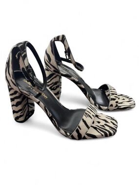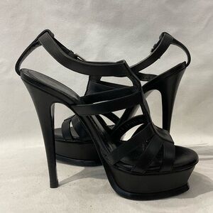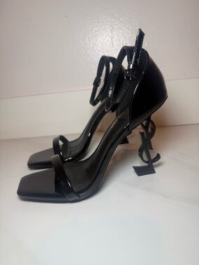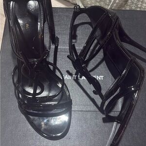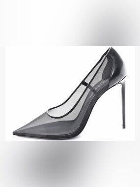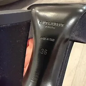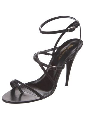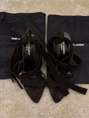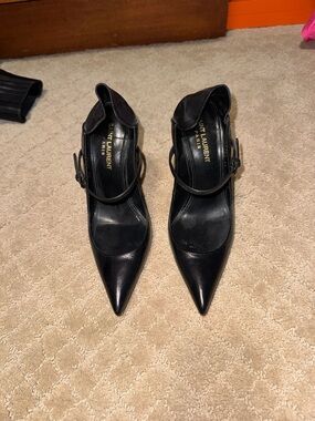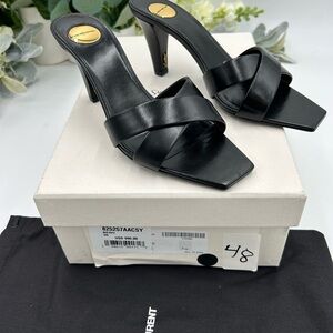 Chic Saint Laurent satin mule heels. Pointed open-toe design. Slip-on silhouette with covered strap. Stiletto heel for elevated style.