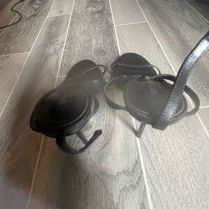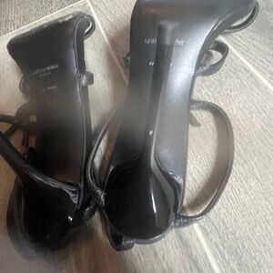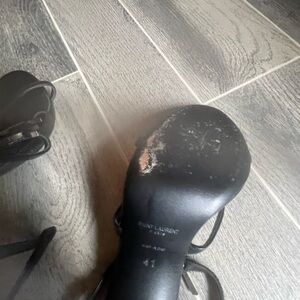 Chic black heels with strappy design. Iconic YSL logo detail. Perfect for elegant outings.