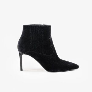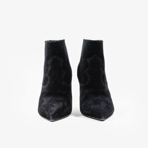 A pair of Western-style black calf suede ankle boots from Saint Laurent. These boots feature a point toe, crown stitching, gussets, a concealed pull tab, and a 8 cm stiletto heel that offers a touch of femininity.