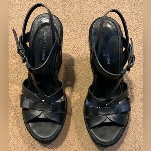 Saint Laurent Black Tribute Wedge Espadrille Sandals; size 38