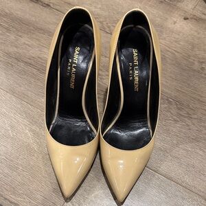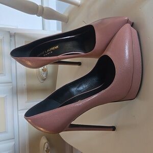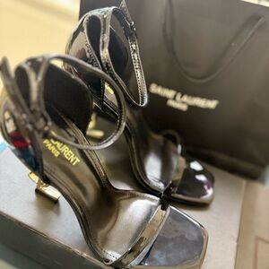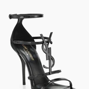 Elegant black heels with a sleek design. Features a striking gold heel. Perfect for a sophisticated look.