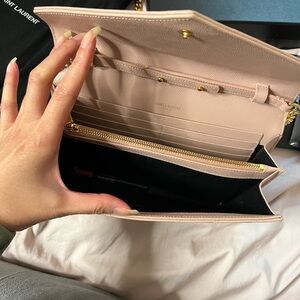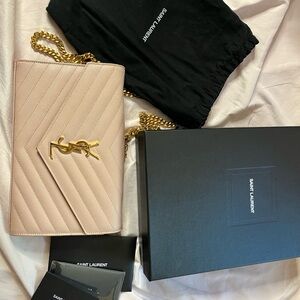 Chic Saint Laurent crossbody in blush quilted leather. Features a striking gold chain and iconic YSL logo. Perfect for any occasion.