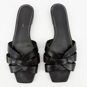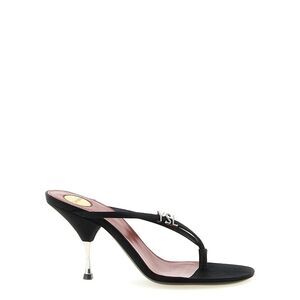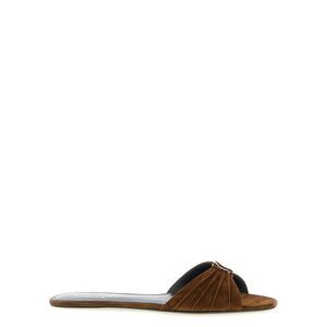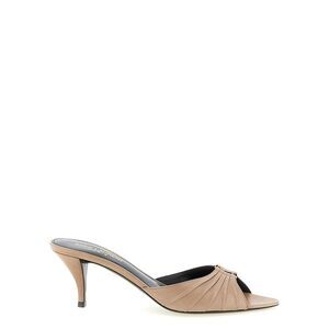 The Babylone Sandals by Saint Laurent are elegant mules with a narrow heel and peep-toe, featuring a gathered upper decorated with the iconic CASSANDRE detail in bronze-toned metal. A leather sole completes the model, combining comfort and refined style for a sophisticated and distinctive look. Season: SS26 Composition: 100% Calf Leather Bos Taurus
