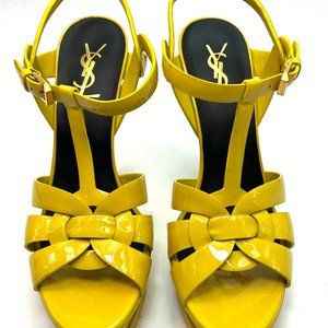 Bold yellow YSL platform patent leather Tribute sandals with signature strappy design. High platform and stiletto heel. Elegant and modern look. Timeless style and luxury.