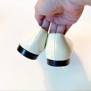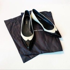Grab compliments everywhere you go wearing these fabulous flats from Saint Laurent Paris! The off-white leather construction is enhanced with black brogue-detailed pointed toes. EUC. Includes Original Box and two dust covers.
