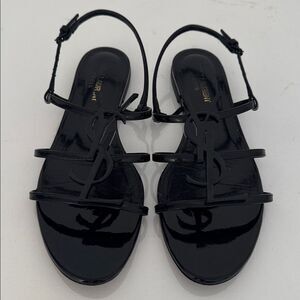 Saint Laurent Cassandra YSL Logo Black Patent Leather Sandals Size EU 38 US 8