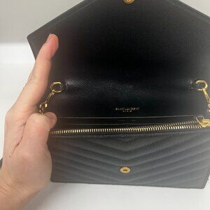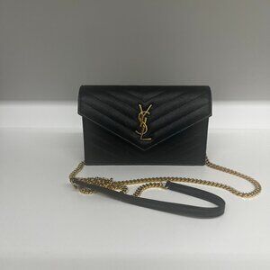 Wallet made with metal-free tanned leather, featuring a flap decorated with the cassandre, quilted overstitching and leather-reinforced removable shoulder strap chain. Gold hardware, Six Card Slots, and made with 100% calfskin leather. Purchased originally in Rome, Italy at the YSL store.