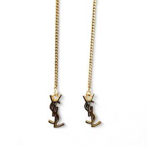 Saint Laurent Cassandre Threader Earrings in Metal in gold. These chic designer earrings feature the iconic YSL Cassandre monogram with a fine chain and pull-through bar threader design. Sleek, elegant, and the perfect way to add instant Parisian luxury to any look.