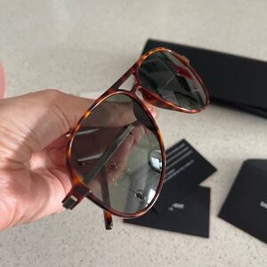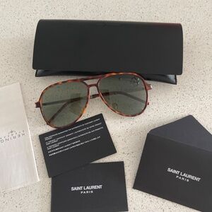 In Havana brown acetate, the Classic 11 aviator-style sunglasses from Saint Laurent sport rounded lenses with a green tint, have a distinct double-bar detail, and are finished with metallic arms, please note that the color of the case may vary from that in the image.