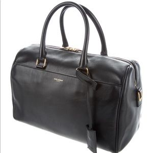 Black Saint Laurent Classic Duffle 6 Bag with gold tone hardware, single detachable flat shoulder strap, dual rolled-up handles, single slit pocket at exterior, protective feet at base, tonal suede interior lining, single zip pocket at interior wall and zip closure at top. Includes dust bag. Very good condition, light scuffing, slight surface scratches and tarnishing of hardware consistent with gentle use. See last pic for dimensions. Poshmark will authenticate.