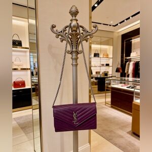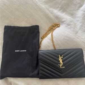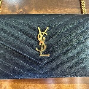 Finally deciding to let this bag go to another home. Purchased from Saint Laurent website. Good condition. Light colored makeup stains inside, looks like they can be cleaned/removed.