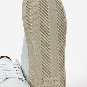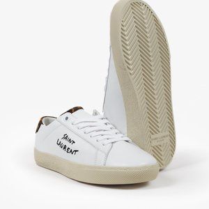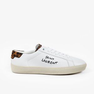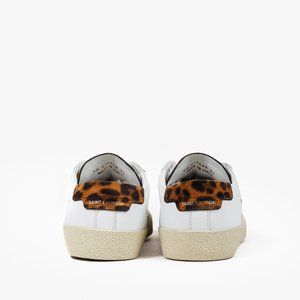 Low-top laced retro tennis-style sneakers featuring a Saint Laurent inscription embroidered along the outstep and a leopard-print suede back tab and tongue trim with embossed and gold Saint Laurent logos.