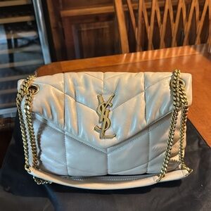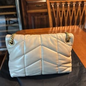 This Saint Laurent shoulder bag showcases a sophisticated cream quilted leather design, complemented by elegant gold-tone chain straps. It's medium size. Excellent condition with no stretches or marks inside or out, with dust cover