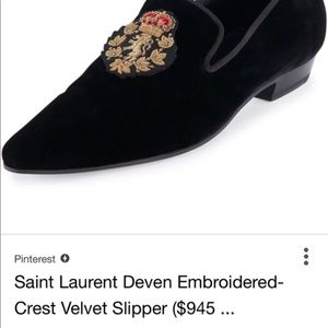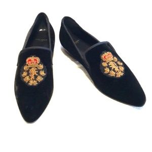 This luxurious looking shoes have a pointed toe and bullion embroidered crest. Grosgrain trim along topline and stitched leather sole.
