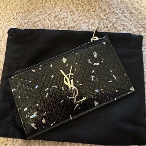 The Saint Laurent YSL Monogram Large Wallet on Chain in Grained Leather Gray is a stylish and luxurious shoulder bag that exudes sophistication. Made from high-quality calfskin and leather, this rectangular bag features a button closure and a silver chain strap, making it both practical and chic. The iconic YSL monogram logo adds a touch of elegance to the classic design, making it a must-have accessory for any fashion-forward woman. Interior lined with gray leather with zip compartments and multiple card slots. 100% Authentic. Made in Italy.