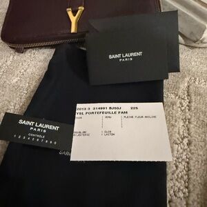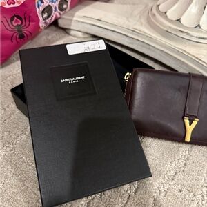 Chic dark brown leather clutch by Saint Laurent. Features a striking gold Y accent. Ideal for a sophisticated touch. In good condition for vintage wallet extremely clean inside outer leather is weathered but still looks great. See photos comes with dust bag and box. No major callouts no ripping, picking or stains.