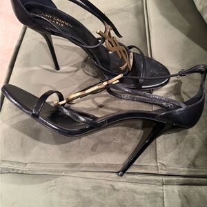 These Sophisticated ultra feminine black heels were crafted in Italy with calfskin leather featuring a striking brushed gold signature YSL logo. Ideal for elegant occasions. This size won’t last long! ( US 11-11.5) EU:42. In EXCELLENT CONDITION!