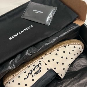 The Saint Laurent polka dot espadrilles are so cute and has a feminine touch to it. It is used in good condition. It is a white fabric so there is signs of wear. There is some yellow water stains on the fabric that I tried to show in the day light in the pictures.