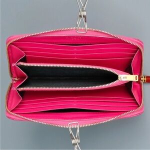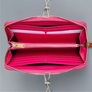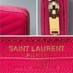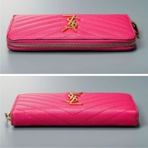 Luxurious fuchsia wallet with iconic YSL logo. Quilted design adds elegance. Perfect for stylish essentials.