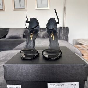 Chic Saint Laurent heels with a glossy finish. Sleek design with ankle strap. Perfect for elevating any outfit.
