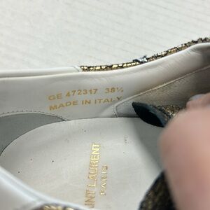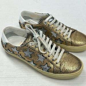 Stylish women's sneakers featuring a striking gold and silver design. Perfect for adding a touch of glamour to any outfit.