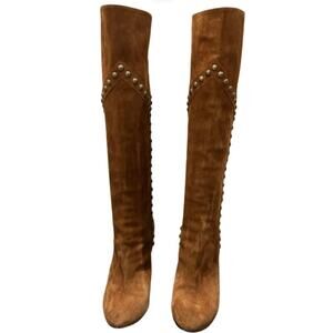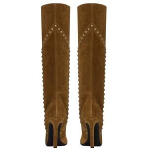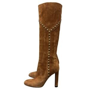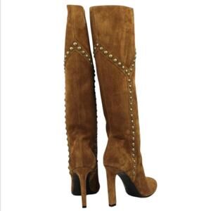 Saint Laurent Grace Y Studded Suede Heeled Knee High Boots in Brown/Tan IT36