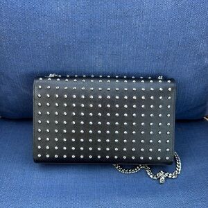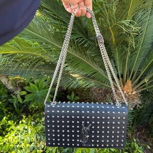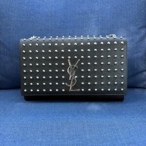 Chic black bag with silver studs. Features a stylish chain strap. Iconic YSL logo on the front.