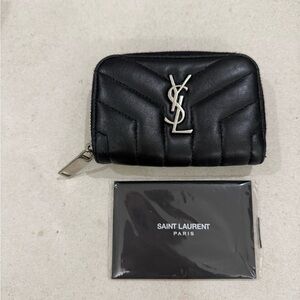 Delivery Duty Paid included – The French fashion house was founded in 1961 by designer Yves Saint Laurent and his partner, Pierre Bergé. Yves Saint Laurent revolutionized the world of women's fashion. In 1963, the current logos were designed by A. M. Cassandre. In efforts to popularize ready-to-wear collections, the brand launched its highly celebrated Rive Gauche line during 1966. To this day, Saint Laurent is internationally recognized for their decidedly modern and elegant creations.Condition Notes: Light scuffs throughout exterior edges and corners. Surface scratches to hardware. Visible marks to interior flap.Width: 4.75"Height: 4"Depth: 1"Circa: 2022Type of Material: LeatherColor: BlackLining: Black LeatherPockets: Four Interior Open, One Bill Compartment, One Interior Zipper, Six Credit Card SlotsHardware: Gold ToneClosure: SnapOrigin: Italy Measurments: width: 120 mm height: 101 mm strap length: 0 mm handle drop: 0 mm