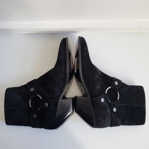These luxe suede leather booties feature a short block heel and a buckled strap detail.