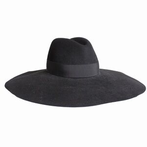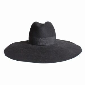 Preowned black wide brim hat, designed by Hedi Slimane for his first runway collection at Saint Laurent in 2012. Made from black rabbit fur felt, this hat features a tear-drop crown that's wrapped in black grosgrain ribbon and an extra wide brim measuring approximately 6in L.