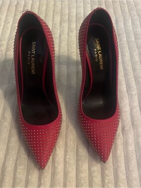 Bold Saint Laurent pumps in glossy hot pink patent leather. Pointed toe with a sleek, elegant silhouette. Slim high heel for a striking profile. Luxurious black interior with gold logo detail.EUC