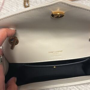 Chic ivory crossbody bag featuring a gold chain and iconic logo. Ideal for stylish outings. Comes with dust bag and box. Brand new.