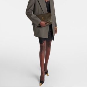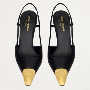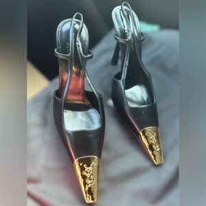 Elevate your style with these Saint Laurent slingback heels. Featuring a sleek black design with striking gold accents, these shoes are perfect for any elegant occasion.