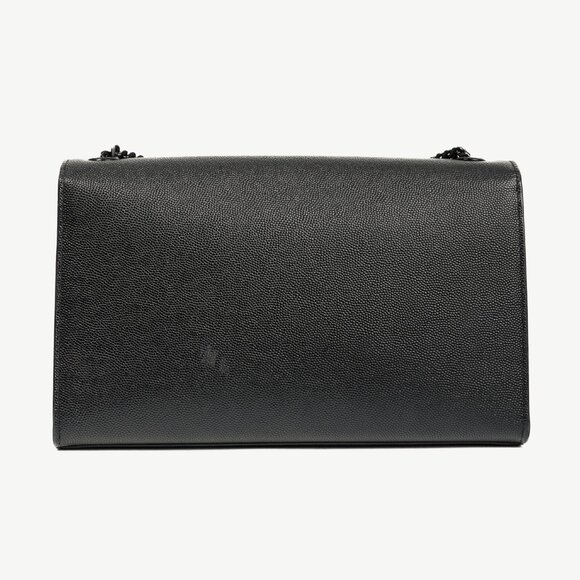 Made in Italy, this iconic Kate shoulder bag from Saint Laurent is crafted with a Grain de Poudre embossed leather in a Nero black, and features tonal metal hardware, a curb-link chain shoulder strap that can be worn on the shoulder or as a crossbody, and the "YSL" Cassandre monogram on the front. Secured with a magnetic snap tab, the front flap opens to a tonal textile-lined interior containing a single slot pocket.