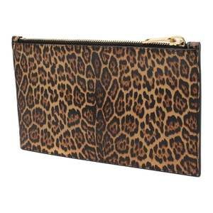 This Saint Laurent pouch is made of smooth calfskin leather in a fun leopard print pattern. Saint Laurent Paris logo printed is printed in gold. Gold top zipper opens to a black fabric interior. This small pouch is perfect to throw into a larger bag, or carry by itself!