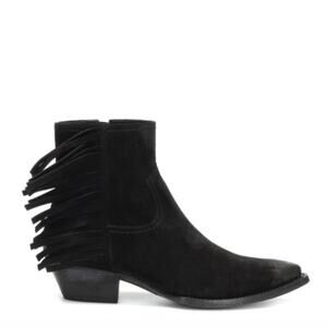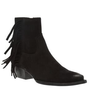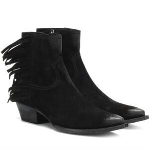 Expertly crafted black suede ankle boots featuring hand-distressed finishes, Western-inspired fringe detailing, and a sleek block heel. The ‘Lukas’ boot blends rugged charm with luxurious construction, perfect for statement styling.