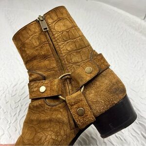 These tan boots feature a Western-inspired design with a sleek pointed toe and a distinctive harness strap around the ankle. Made from soft suede or nubuck leather, they offer a velvety texture and a slightly distressed finish. The low stacked heel adds a touch of elegance to this stylish footwear.
