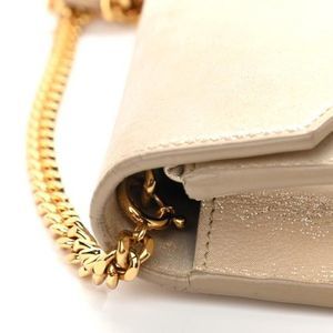 We guarantee this is an authentic SAINT LAURENT Metallic Fabric Monogram Envelope Chain Wallet Champagne or 100% of your money back. This elegant wallet on a chain is crafted of shimmery iridescent smooth leather in champagne. The bag features a waist-length gold chain shoulder strap with a shoulder pad and a gold classic YSL emblem on the flap. This opens to a black leather interior with card slots, zipper pocket, and patch pockets.