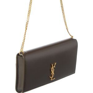 About the brand: Iconic, modern glam. Tres chic! Made in Italy Monogram Leather Wallet On Chain in grey leather with gold-tone hardware, monogram accent and slide pocket Interior design details: leather and fabric lining, interior pocket Measures 7in wide x 4in high x 1.5in deep Shoulder strap drops 20in Fold-over flap with snap closure Please note: All measurements were taken by hand and are approximate; slight variations may occur. Our products are 100% genuine. In some cases we purchase merchandise from trusted independent suppliers and not directly from the brand owner. In all cases we stand by the authenticity of every product sold on our site.