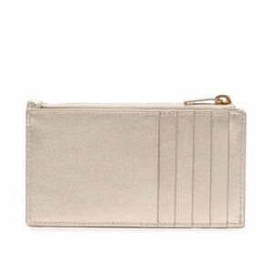 gold calf leather metallic finish signature YSL logo plaque gold-tone hardware main compartment rear card slots top zip fastening