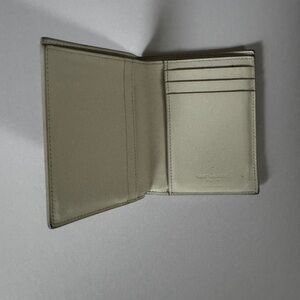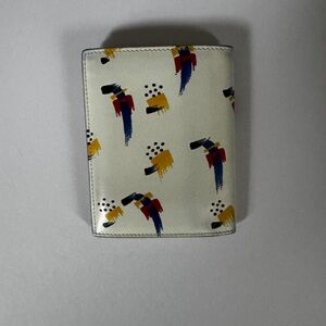 Stylish Saint Laurent wallet with a vibrant multicolor design. Features abstract patterns in yellow, blue, red, and black on a cream background.