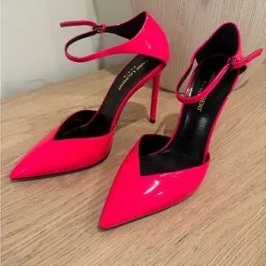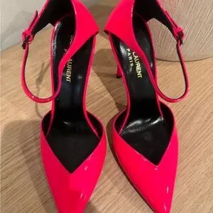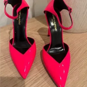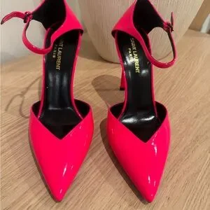 Saint Laurent Neon Pink Patent Pointed-Toe Ankle-Strap Pumps