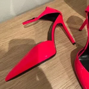 Bold neon pink patent leather. Pointed toe with V-shaped vamp. Adjustable ankle strap for secure wear. Sleek high heel silhouette for statement looks.