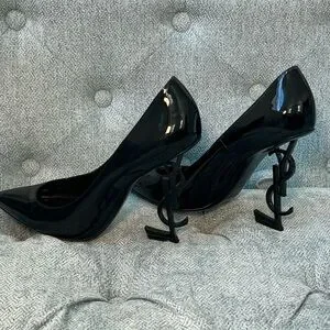 Defined by the iconic YSL initials heel, Saint Laurent’s Opyum pointed toe pumps are crafted from black patent leather and boast a branded footbed. Sleek and sophisticated design. Perfect for elevating any outfit