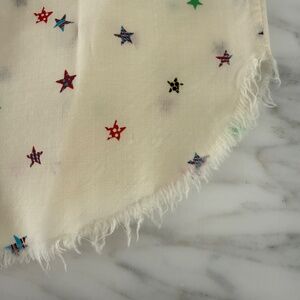 Raw frayed edges at hem and sleeves, button front closure, vibrant multicolor star print.